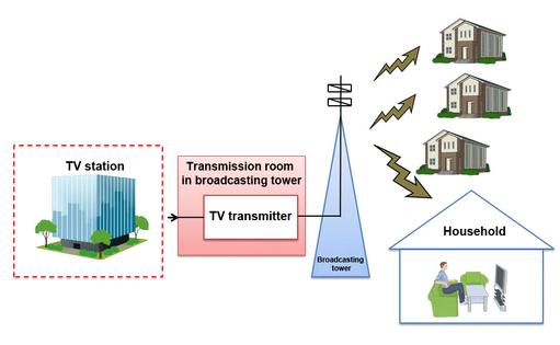 The graphic to the right show how a TV station transmits a signal through the air and is received by a home TV receiver.